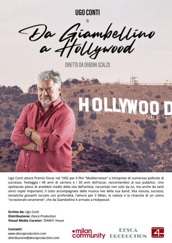 Da allora la sua filmografia si arricchisce di ruoli in cinema e televisione, mostrando una presenza solida sia nelle commedie sia nei lavori più drammatici, fino alla partecipazione ad altri progetti televisivi e performance dal vivo. Parallelamente all’attività cinematografica, Ugo Conti coltiva una forte passione per la musica e lo spettacolo dal vivo, portando in scena performance che intrecciano recitazione e canto, e consolidando il suo rapporto con il pubblico italiano. Oggi, questo viaggio umano e artistico diventa racconto teatrale con “Da Giambellino a Hollywood”, spettacolo scritto da Ugo Conti e diretto dalla regista Debora Scalzo, pronto a debuttare nei teatri italiani. Un monologo-intreccio che ripercorre la sua storia: dall’infanzia nel quartiere popolare milanese fino al sogno americano, passando per il lavoro, gli incontri, le cadute e le conquiste. Lo spettacolo è prodotto e distribuito da Desca Production e Team 41 House, in collaborazione con Milan Community , il talk show ufficiale dei rossoneri fondato e diretto dal giornalista sportivo Luca Serafini , a suggellare un legame profondo con Milano, la sua identità e la sua memoria collettiva. Un racconto sincero, ironico e necessario, che restituisce il senso di un percorso unico: quello di un uomo che non ha mai dimenticato da dove viene, anche quando è arrivato lontano.